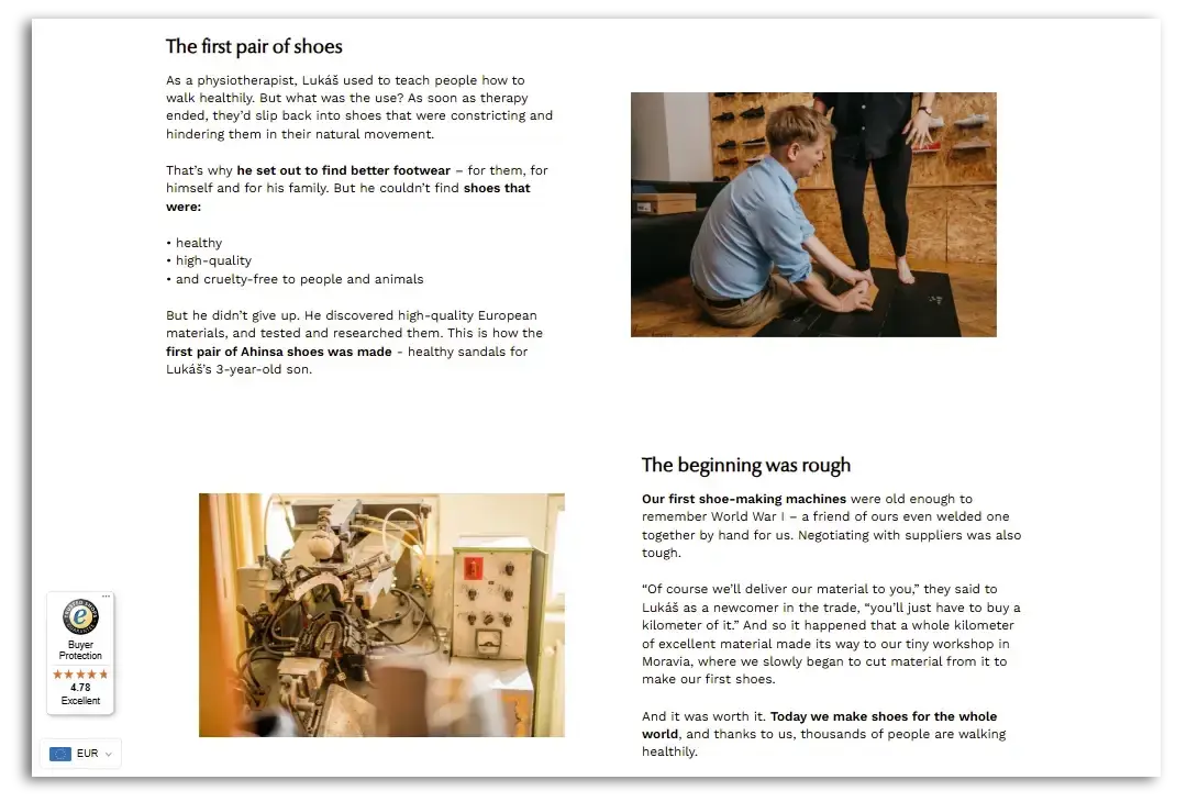 In the example below from Ahinsa Shoes, we meet the founder, Lukáš Klimpera, a physiotherapist who tells users, “I wasn’t able to find healthy, high-quality and ethical shoes. So I made my own”. As the reader scrolls down, they meet the other people who made his brand possible, and we learn about their first pair of shoes and the process of getting the business off the ground.
