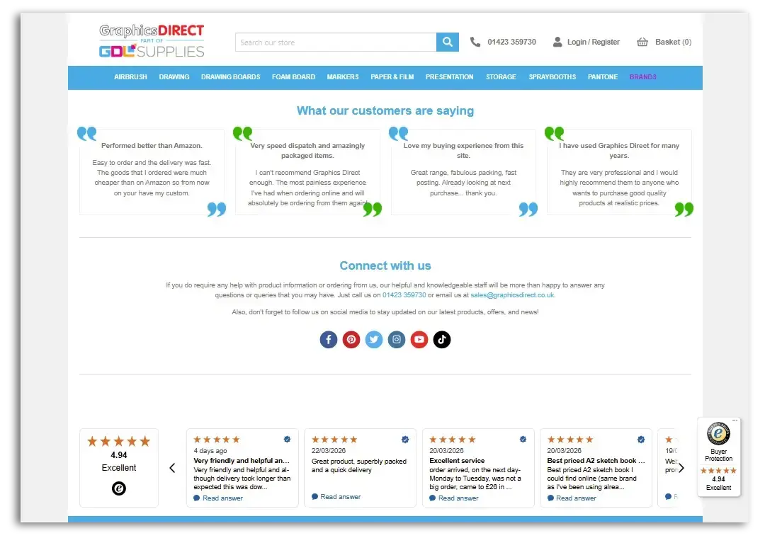 In this example from Graphics Direct, they’ve highlighted some specific reviews they’ve received over the years while also displaying a reviews widget with some of the more recent reviews.