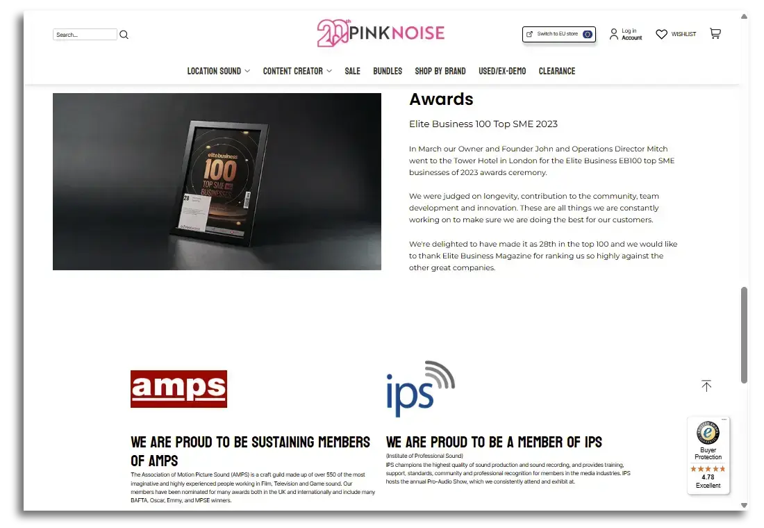 In this example from Pinknoise Systems, they highlight the company’s story, introduce their team, and follow it up with both the awards they’ve won and their industry memberships: