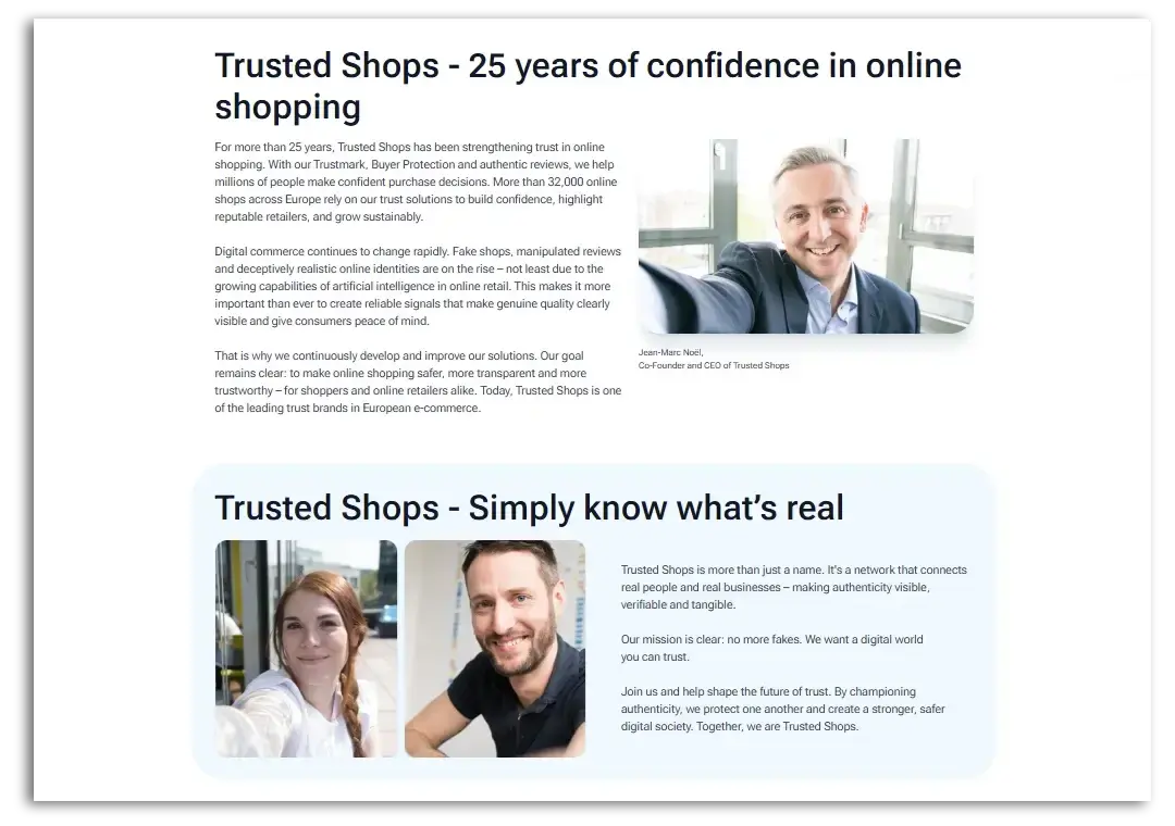 On the Trusted Shops About Us page, we talk about the history of the company and how our products help both shoppers and retailers. But what good is a trust solution if you don’t know who’s behind the company? That’s why we introduce our CEO as well as some employees.