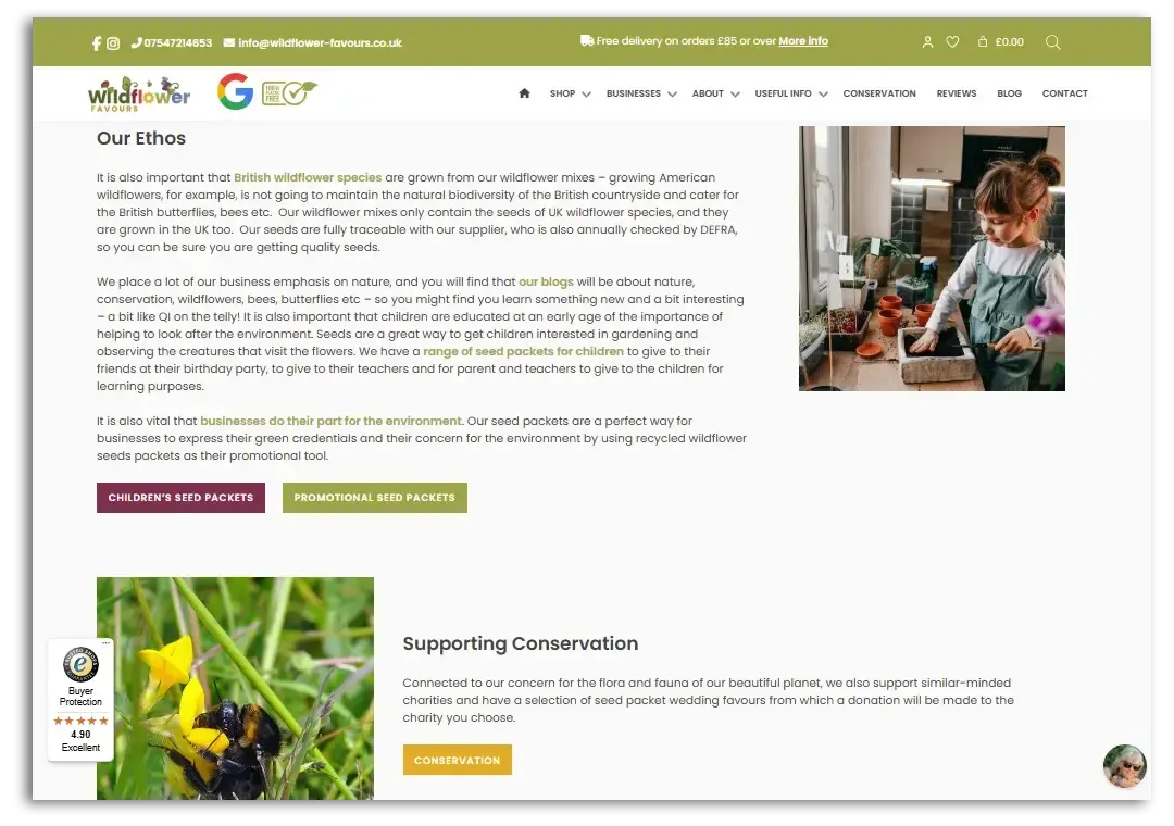 In this example from Wildflower Favours, the company explains who they are, what their ethos is, how they support conservation, and what the company does to be sustainable.