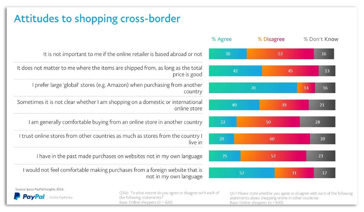 The most lop-sided responses came with the third statement (i.e. I prefer large global stores (e.g. Amazon) when purchasing from another country). 70% of respondents agreed with this, while only 14% disagreed.