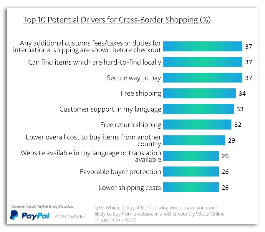 When it comes to motivators for shopping abroad, we can see that the top 3 reasons deal with transparency, availability, and safety (all with 37%). Free shipping (34%), native language support (33%), and free returns (32%) round out the top answers.
