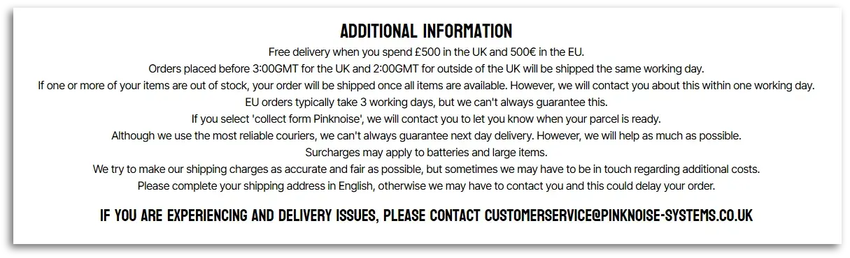 Be realistic and clear about shipping times. Overpromising and underdelivering damages trust far more than slightly longer (but honest) timelines. In the following example from PinkNoise Systems, they describe the delivery process and the expected wait times in clear detail.