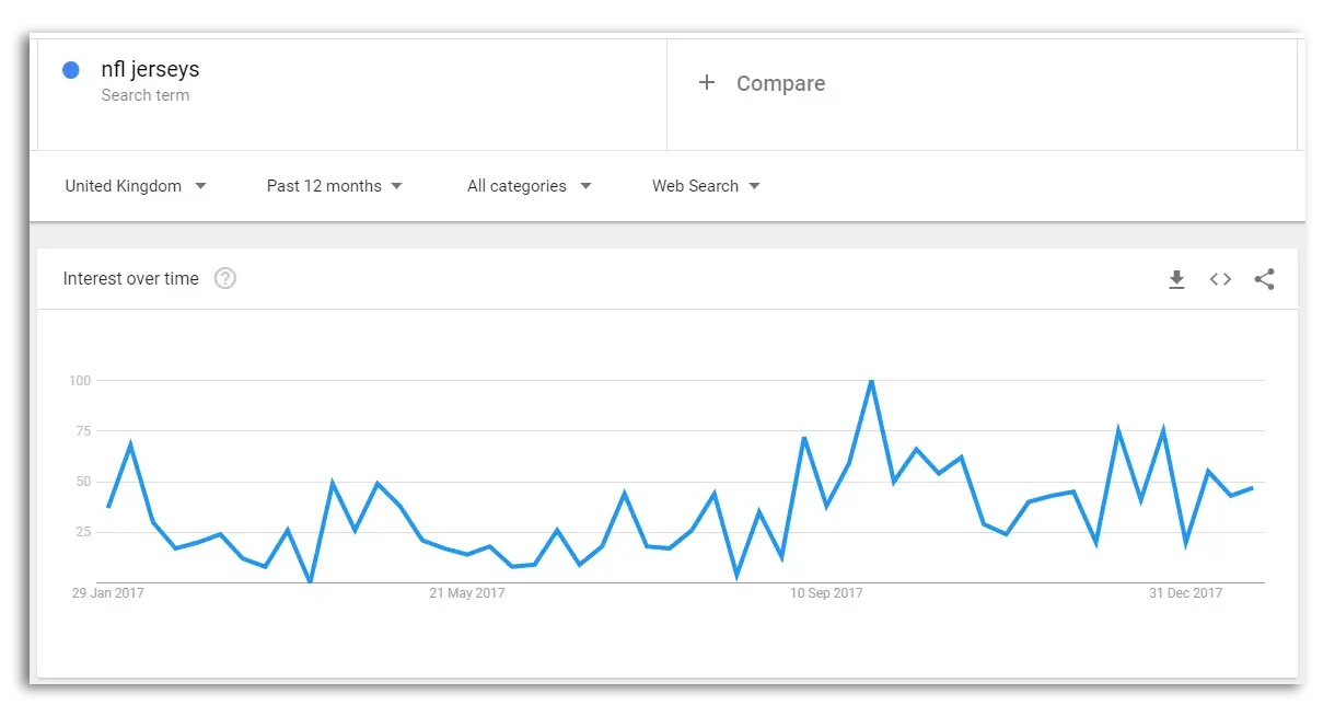Searches for “NFL jerseys” peak around the beginning and the end of the season in the UK.