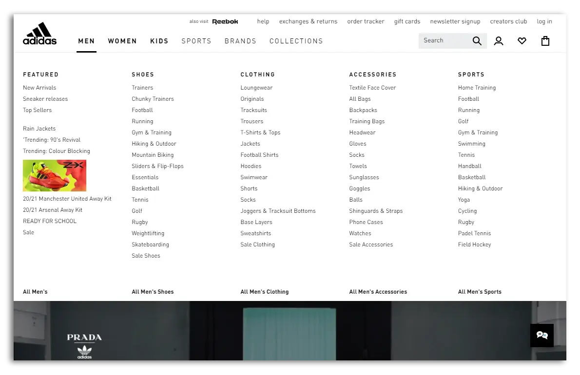 Adidas has a lot of product categories. Once you click on a main category in the navigation (e.g. Men), the mega menu appears below it (Source: Adidas)