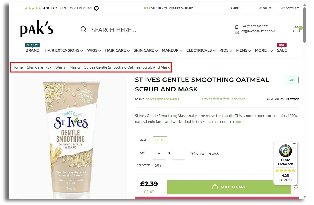 PakCosmetics' product pages have breadcrumbs (highlighted in red box), so that users can move backwards through the product categories and explore the site.