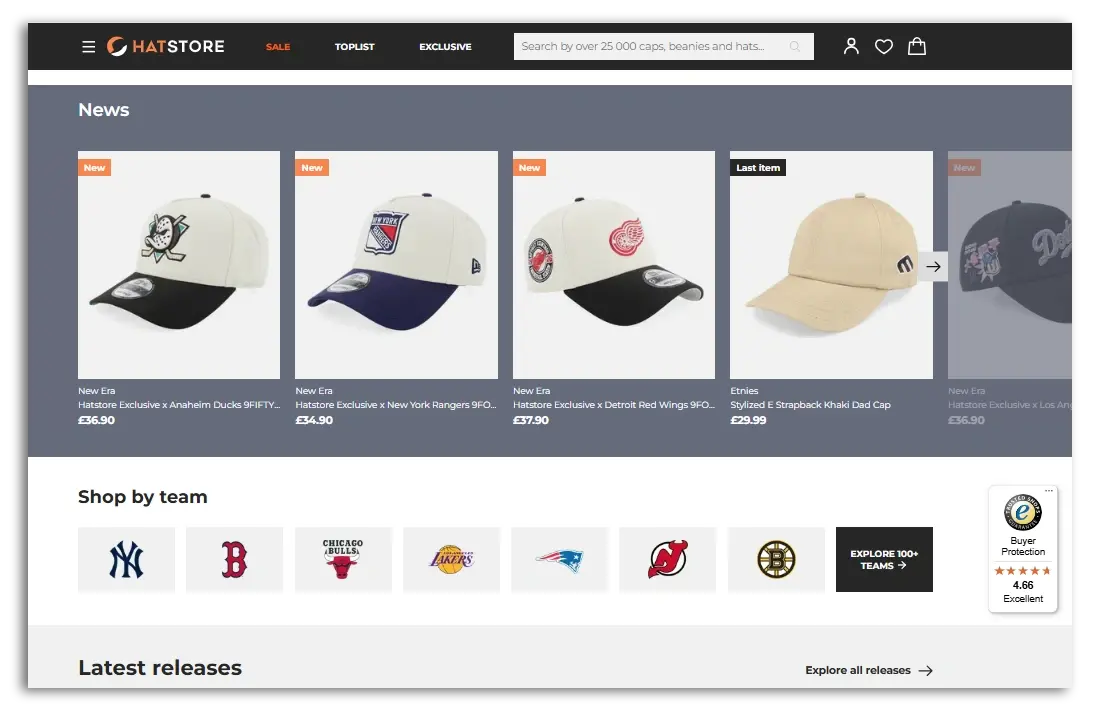The navigation on the Hatstore website stays at the top of the page, allowing users to click on the most popular links at any time.
