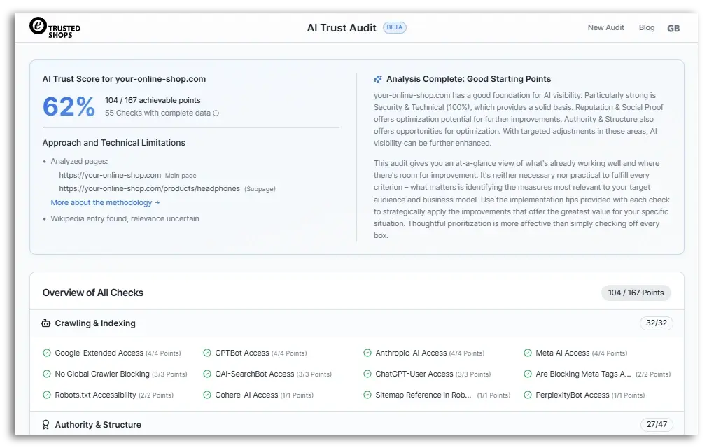Do you want to know how well AI can find your online shop and where you can still improve? Take the free AI Trust Audit from Trusted Shops (also available to non-member shops).