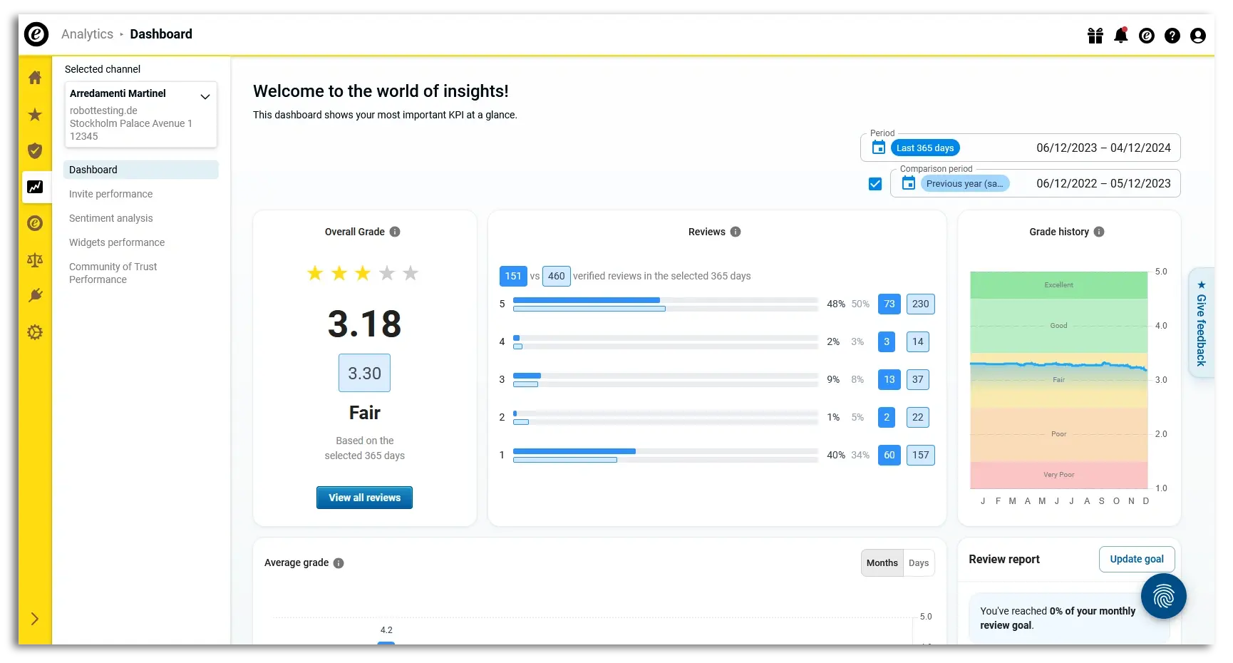 The general dashboard is included with all paid Trusted Shops memberships. If you want to know how your review score is structured, how it's evolved, and how you're doing compared to previous periods, this dashboard will help you.