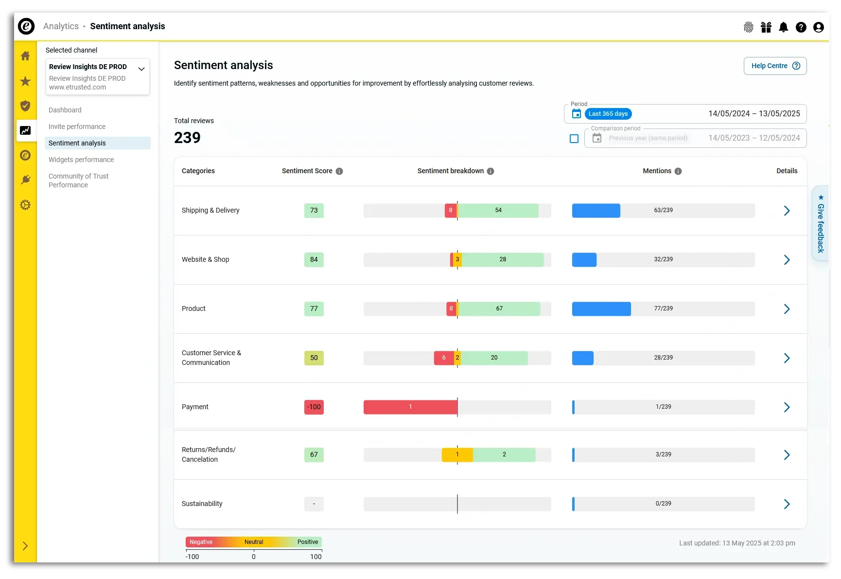 This analysis will help you prioritise the elements of your shop that you want to optimise. For example, you might have a -100 Sentiment Score for Payment, but if only one customer talked about it, then you might decide to focus on Customer Service & Communication, which has six reviews with negative mentions.