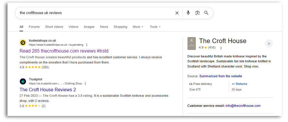 It’s also important to understand that Google limits some reviews from being displayed in certain places: Google no longer allows shops to display their own seller rating/store rating directly next to their own domain in organic search results. That means that store ratings can only appear next to trusted 3rd party review sites (e.g. the dedicated shop reviews page on Trusted Shops).