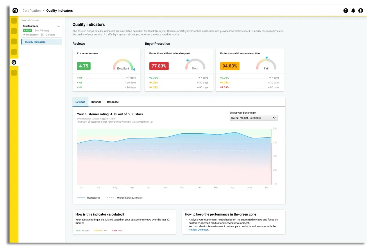 Businesses that pass the Trusted Shops audit process can display the Trusted Shops Trustmark (which includes a 30-day Buyer Protection) on their website.