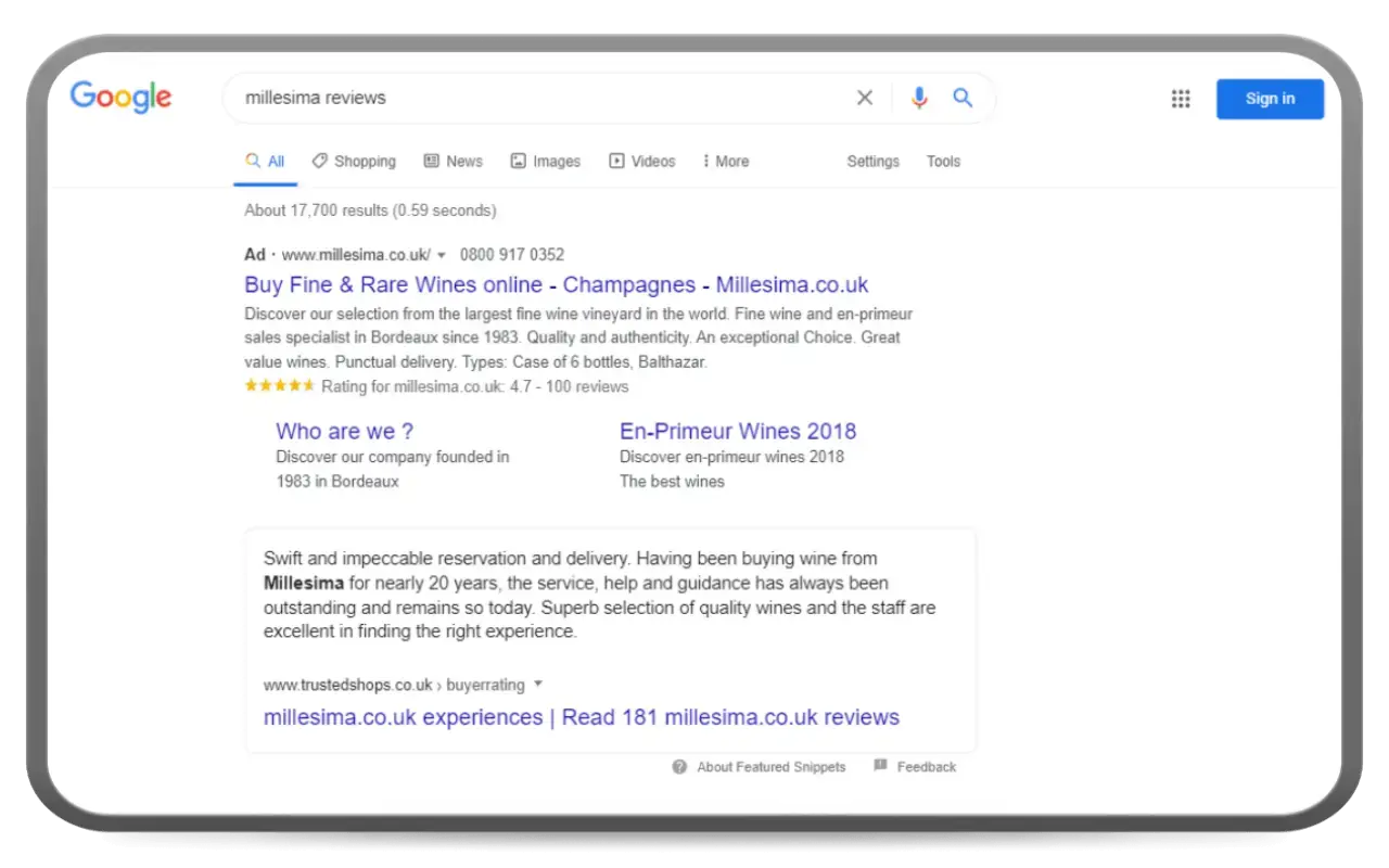 Some review platforms (like Trusted Shops) are officially recognised by Google. This means you’re able to show your well-earned stars in your paid Google Ads and/or in Google Shopping. It will make your advertisement stand out from the competition, and on top of that, it will save you money on your ads – a higher click rate on your ads (and more conversions on your page) leads to a lower cost-per-click (CPC) for your ads.